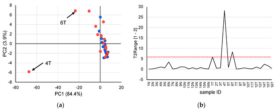 To examine the outliers, the T2 statistic and upper control limit were used to evaluate the results of PCA with autoscaling [32]. The T2 statistic in each sample was evaluated using Equation (1).