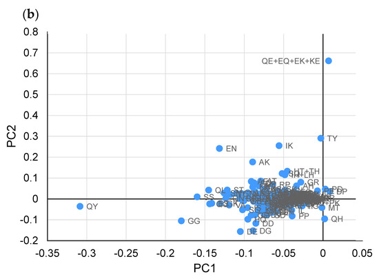 Next, PCA based on Pareto scaling was performed using the remaining 14 samples (each sample contained non-tumor and tumor tissues, respectively), excluding samples showing outliers (Figure 2). In the PCA score plot (Figure 2a), nontumor and tumor tissues were sufficiently separated mainly by principal component 2. In addition, QE (Gln-Glu) + EQ (Glu-Gln) + EK (Glu-Lys) + KE (Lys-Glu) (overlapped peak) and TY (The-Tyr), IK (Ile-Lys), and EN (Glu-Asn) showed relatively large values in principal component 2 of the loading plot (Figure 2b), suggesting that these dipeptides contributed to the separation of nontumor and tumor tissues.