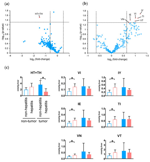 Volcano plot of differential dipeptides in the tumor (a) and nontumor (b) tissues with and without hepatitis in hepatocellular carcinoma. For each dipeptide, the −log10 (p-value) was plotted vs. log2 (fold-change). (c) Dipeptides showing a significant difference in the volcano plot (p < 0.05 and fold-change < 0.67 or > 1.5). The columns represent the average number of moles (nmol/g tissue), and error bars indicate the standard deviation. * p < 0.05.