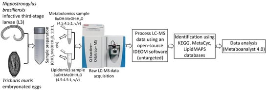 Schematic flowchart of the metabolomic and lipidomic profiling strategy applied for the infective stages of the N. brasiliensis (L3) and T. muris (embryonated eggs).
