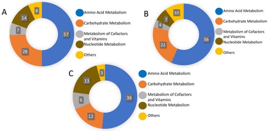 Based on the 164 putative polar metabolites identified from the three biological samples (114 metabolites from NB_SE, 99 from NB_ESP, 70 from TM_SE), we deduced metabolic pathways (MAPs) by mapping all the compounds against known metabolite pathways for helminths in the Kyoto Encyclopedia of Genes and Genomes (KEGG), Human Metabolome Database (HMDB), and MetaCyc Metabolic Pathway database. In all three sample groups, the highest number of identified metabolites/compounds were products of amino acid metabolism, followed by carbohydrate metabolism in NB_SE and NB_ESP, and nucleotide metabolism in TM_SE, as shown in Figure 2A–C. For example, of 114 metabolites identified from the NB_SE, 57 metabolites were produced through amino acid metabolism, 28 by carbohydrate metabolism, and 14 by nucleotide metabolism. A similar pattern can be seen in its ESP. Of 70 polar metabolites identified from TM_SE, 36 of them were the products of amino acid metabolism, 13 were from nucleotide metabolism, and 12 were from carbohydrate metabolism.
