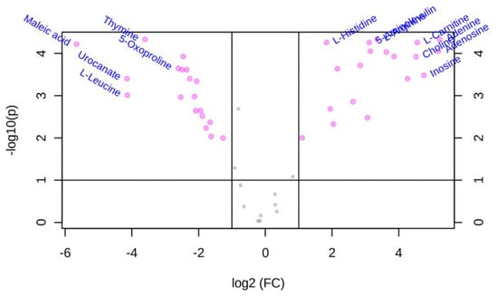 Volcano plot of untargeted metabolomics analysis of differential features (i.e., 49 MSI-I (Metabolomics Standard Initiative level-1) identified polar metabolites from somatic extracts) between the somatic extract of infective third-stage larvae (L3) of N. brasiliensis (NB_SE) and the somatic extract of T. muris embryonated eggs (TM_SE). The volcano plot displays log2 fold changes versus Benjamini–Hochberg adjusted p-values (−log10 transformed). Features that exhibited an absolute log2 fold change > 2 and an absolute p-value < 0.05 are coloured in pink. Most significant metabolites are labelled with the corresponding name.