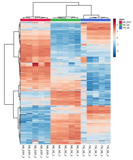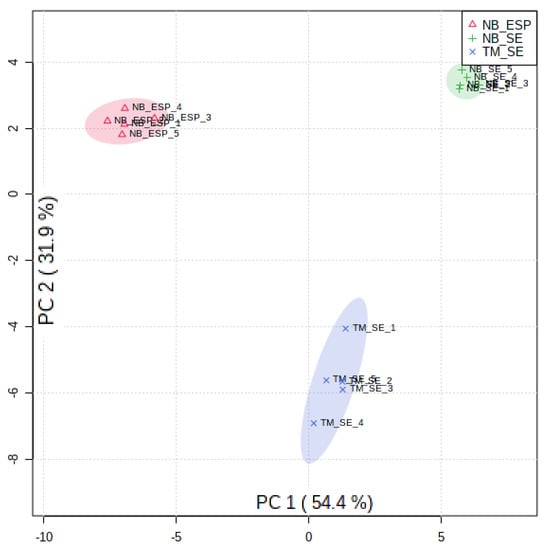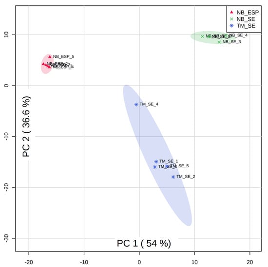 A principal component analysis of the 350 putative lipids (listed in Supplementary Table S2) showed clear segregation of the clusters among all three sample groups (NB_SE, NB_ESP, and TM_SE) as presented in Figure 8. These results indicate a high level of heterogeneity in the lipidomes of the two helminths.