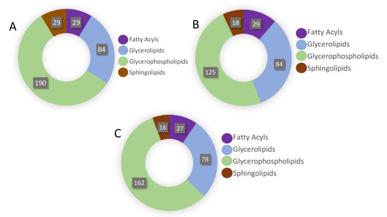 Distribution of putative lipids by lipid classes: (A) in the somatic extract of infective third-stage larvae (L3) of N. brasiliensis (NB_SE); (B) in the excretory/secretory products (ESP) of N. brasiliensis L3 (NB_ESP); (C) in the somatic extract of T. muris embryonated eggs (TM_SE).