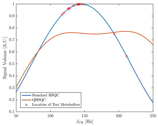 Dependency of H-C-HSQC cross-peak signal volumes on the scalar coupling constant JCH for a standard HSQC experiment with an INEPT delay ms in blue and a Q-HSQC experiment with INEPT delays of and ms, respectively, at a ratio of 3:1 in orange. The crosses indicate the JCH-coupling values of 20 signals of the metabolites in the used model mixture (see Materials and Methods section for details).