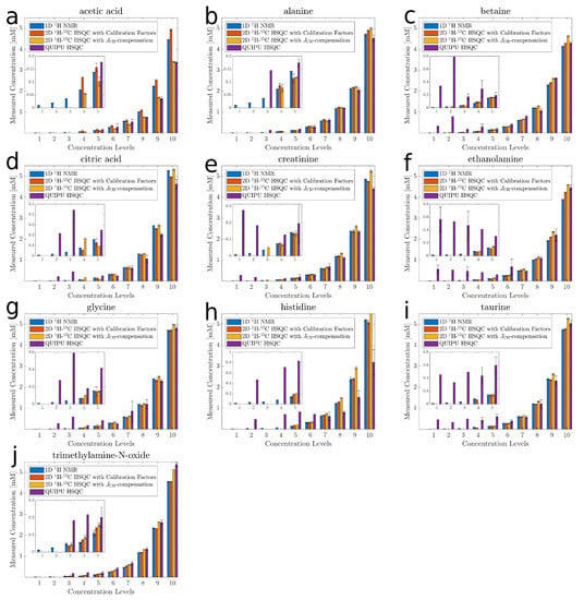 Comparison of concentration estimates for acetic acid (a), alanine (b), betaine (c), citric acid (d), creatinine (e), ethanolamine (f), glycine (g), histidine (h), taurine (i), and trimethylamine-N-oxide (j). The x-axis shows the ten concentration levels and the y-axis the observed concentrations with 1D H NMR in blue, standard HSQC in red, Q-HSQC in orange and QUIPU-HSQC in purple. The lower five concentration levels are added as inserts. The concentration values are means over technical triplicates. In the case that the compound was detected in all three replicates, the corresponding standard deviation is included as a measure of error.