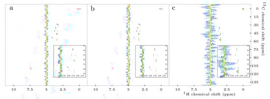 Exemplary 2D H-C-HSQC spectra obtained by means of: standard HSQC (a); Q-HSQC (b); and QUIPU-HSQC (c). Inserts depict the spectral regions of 70.0–35.0 and 5.5–2.0 ppm. A considerable number of signals stemming from aliphatic protons of the investigated metabolites is located in this region. Furthermore, the residual water signal at 4.78 ppm is located in this region, thus frequent overlap is present.