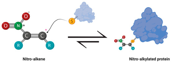 Michael addition between an electrophilic nitroalkene and a nucleophilic thiol group of a protein. The nitro moiety creates an electrophilic carbon (*) susceptible to nucleophilic attack by the thiol group of an amino acid residue, such as cysteine. Reactions with soft electrophiles create a reversible adduct that can alter the cell signaling activity or enzymatic activity of the effected protein.