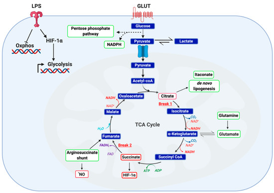 Metabolic phenotype of classically LPS-activated macrophage. LPS activated macrophages are defined by a highly glycolytic phenotype with a disrupted tricarboxylic acid (TCA) cycle and attenuated cellular respiration. Recent studies employing carbon flux analysis identified two breaks in the TCA cycle, one at isocitrate dehydrogenase (IDH) and the other at succinate dehydrogenase (SDH). This phenomenon results in the accumulation of both citrate and succinate, key metabolic intermediates capable of functioning as inflammatory signaling mediators. While citrate functions as a precursor to itaconate, prostaglandins and •NO, succinate is capable of protein post-translational modification and stabilizing HIF-1α. Furthermore, accumulation of both succinate and reactive oxygen species (ROS) stabilize HIF-1α, thereby potentiating glucose utilization and downstream inflammatory programming. It has been posited that succinate accumulation in LPS-activated macrophages is the result of itaconate production and subsequent inhibition of SDH) Finally, two anaplerotic pathways are utilized by activated macrophage as a fuel source: the glutamine shunt and the arginosuccinate shunt. Together, these changes manifest in altered cellular metabolism to meet the bioenergetic demands of the cell.