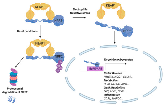 Activation of the Electrophilic Response Element/Antioxidant Response Element (EpRE/ARE). During oxidative stress or exogenous addition of an electrophile, NRF2 is released from its cytosolic binding partner, KEAP1. NRF2 translocates to the nucleus, where it binds to the Antioxidant Response Element (ARE) and induces target gene expression. Target genes include those involved in redox balance, metabolism, lipid metabolism, and inflammation. Under basal conditions, NRF2 remains bound to KEAP1, while subsequently experiencing ubiquitinylation and proteasomal degradation.