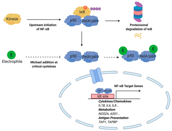 Electrophiles inhibit NF-κB activity by binding to the p50 and RelA/p65 protein subunits. Michael addition at cysteine moieties prevent nuclear translocation required for target gene expression. Under inflammatory conditions, kinase activity induced by upstream NF-κB signaling results in phosphorylation, ubiquitinylation, and proteasomal degradation of IκB. Subsequently, NF-κB translocates to the nucleus to initiate target gene expression.