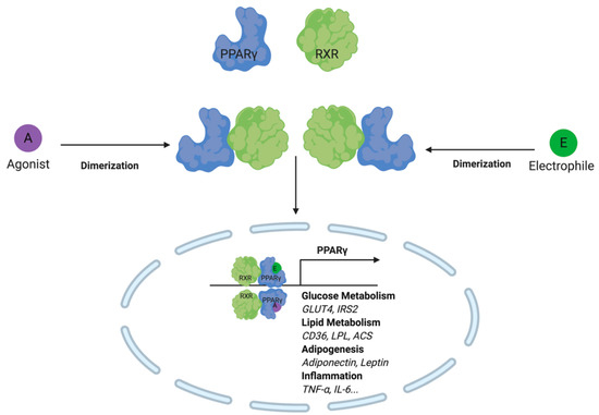 Lipid electrophiles activate PPARγ by creating an adduct at the c-terminal region ligand-binding domain. Similar to PPARγ agonists, lipid electrophiles activate the transcription factor and trigger target gene expression. Target genes include those involved in glucose metabolism, lipid metabolism, adipogenesis and inflammation.
