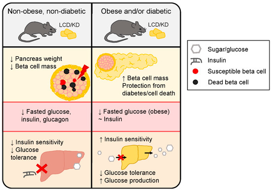 Extreme carbohydrate-restricted diets may confer some benefits in obese and diabetic rodents compared to healthy rodents. Some reports of ketogenic diet (KD) and carbohydrate-free diets (CFDs) demonstrate protection against the onset of diabetes with improved beta cell survival or proliferation after streptozotocin treatment. Low-carbohydrate diets (LCDs) improve fasted and random glycemia but worsen insulin responsivity during hyperinsulinemic euglycemia clamp studies and increase glycemia during glucose tolerance tests.