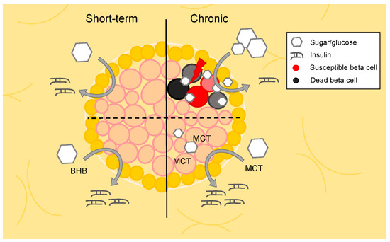 Short-term and chronic effects of metabolites on pancreatic beta cell insulin secretion. In vitro investigations in isolated islets reveal an additive effect of BHB and glucose on insulin secretion, but no insulin secretion with BHB alone. While long-term treatment with high glucose can lead to reduced glucose-stimulated insulin secretion, some evidence suggests increased insulin secretion in response to high glucose following chronic (72 h) treatment with ketones and medium chain triglycerides. BHB: beta-hydroxy butyrate; MCT: medium chain triglycerides.