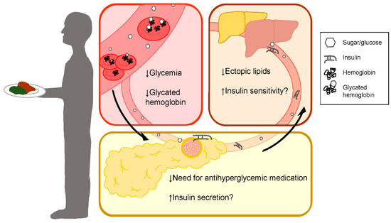 - Müller, J.E.; Sträter-Müller, D.; Marks, H.J.; Gläsner, M.; Kneppe, P.; Clemens-Harmening, B.; Menker, H. Carbohydrate Restricted Diet in Conjunction with Metformin and Liraglutide Is an Effective Treatment in Patients with Deteriorated Type 2 Diabetes Mellitus: Proof-of-Concept Study. Nutr. Metab. 2011, 8, 92. [Google Scholar] [CrossRef] [PubMed]