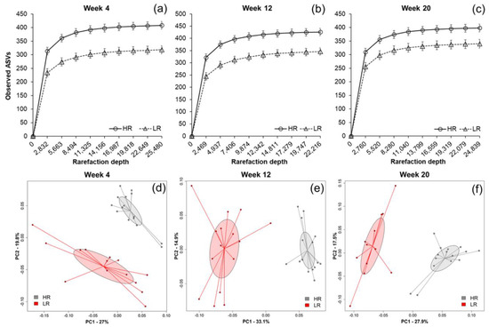 Alpha rarefaction curves (a–c) at each time collection point describing the number of observed amplicon sequence variants (ASVs) (y-axis) as a function of sequencing depth (x-axis); principal coordinates analysis (PCoA) plots of Weighted UniFrac metrics (d–f) representing individual fecal communities (●, high-risk (HR); ●, lower-risk (LR)) at each collection point. Confidence ellipses are presented in color for each dietary group (99% CI based on standard error).