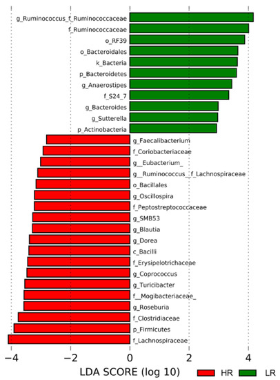 Linear discriminant analysis effect size (LEfSe) plot describing the enriched taxa identified in each treatment group across all time points (HR, n = 45; LR, n = 41). The plot displays taxa with linear discriminant analysis (LDA) scores above 2.0 and p-values < 0.01. Abbreviations: g, genus; f, family; o, order; k, kingdom; p, phylum; c, class.