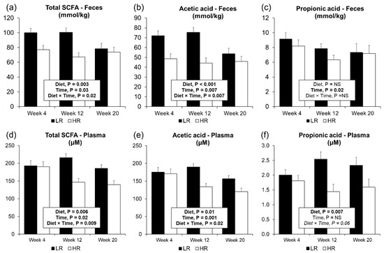 Short-chain fatty acids (SCFA) measured in feces and plasma from Gottingen Minipigs fed the HR or LR diets. Fecal SCFA were measured by gas chromatography (a–c). In fasting plasma SCFA were analyzed by targeted liquid chromatography mass spectrometry (d–f). Abbreviations: NA, non-significant (p-values > 0.1).