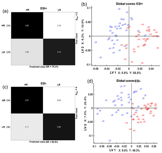 Sparse multi-block partial least squares regression (sMBPLSR) confusion matrices (a,c) and global score plots (b,d) from classification analysis of HR and LR groups using plasma, urine, and feces metabolomics in positive (a,b) and negative (c,d) ionization mode. The success rate (SR) of cross-validation is provided together with the number of latent variables of the models (AOpt). Numbers in parentheses (a,c) reflect the number of samples used in the multi-block analysis after a sample-to-sample correspondence. Explained variances (%) in matrices X and Y by the corresponding latent variables (LV) are provided (b,d).