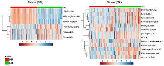 All metabolites identified by the sMBPLSR models (ESI+/ESI−) between the LR and HR dietary intervention are presented in Table S3. Selection based on the sparse regression coefficients revealed 66, 72, and 152 discriminating compounds found in plasma, urine, and feces, respectively. Univariate ANOVA showed 19 significantly distinct metabolites (for exact p-Values refer to Table S3) between the two dietary groups in plasma (Figure 5), 33 in urine (Figure 6), and 79 in feces (Figure 7). Only a few plasma metabolites were increased with the HR diet (methionine, 4-hydroxyisoleucine, betaine aldehyde, indoxyl sulfate, pantothenic acid, and vanillin-4-sulfate) compared to LR (Figure 5). The remaining metabolites were higher with the LR diet (phenylacetylglycine, fatty acid (1) (m/z 357.2800), bile acid (2) (m/z 391.2855), 2-hydroxybutyrate, L-amino-3-oxobutanoic acid, p-cresol sulfate, 3-indole propionic acid, and ursodeoxycholic acid). Ketoleucine, ketoisoleucine, and α-ketoisovaleric acid were found higher in the plasma of the LR group (Figure 5). These metabolites are found in the leucine, isoleucine, and valine catabolic pathways representing the first degradation products of the well-known branched-chain amino acids (BCAA). In ESI, phenylacetylglycine was significantly increased in the plasma of the LR group, whereas hippuric acid only presented a tendency (Table S2). These two metabolites are associated with phenylalanine metabolism.