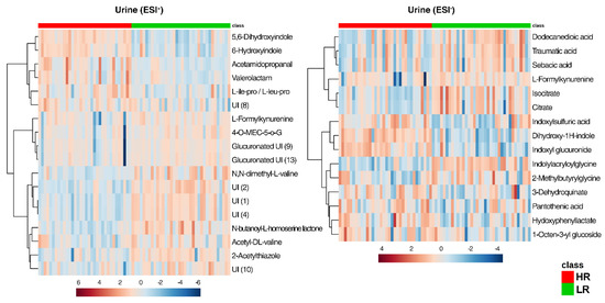 Heat maps of metabolites discriminating (p < 0.05) between the HR (red class) and the LR (green class) diet in the urine of Göttingen Minipigs in both positive and negative ionization mode (ESI+, ESI−). Abbreviations: 4-O-MEC-5-O-G, 4-O-methyl-epicatechin-5-O-beta-glucuronide; UI, unidentified compound.