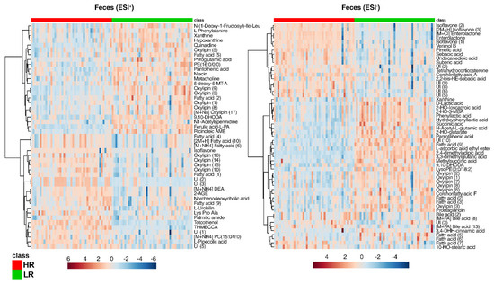 Heat maps of metabolites discriminating (p < 0.05) between the HR (red class) and the LR (green class) diet in feces of Göttingen Minipigs in both positive and negative ionization mode (ESI+, ESI−). Abbreviations: PE, phosphatidylethanolamine; 5-deoxy-5-MT-A, 5-deoxy-5-(methylthio)adenosine; 9,10-DHODA, 9,10-dihydroxy-octadecanedioic acid; L-PA, L-pipecolic acid; Ricinoleic AME, Ricinoleic acid methyl ester; DEA, docosatetraenoyl ethanolamide; 2-AGE, 2-arachidonyl glycerol ether; THMBCCA, tetrahydro-1-methyl-beta-carboline-3-carboxylic acid; PC, phosphatidylcholine; UI, unidentified; HO, hydroxyl; 2-HO-3-MBA, 2-hydroxy-3methylbutyric acid; LysoPE, lysophosphatidylethanolamine; DHH, dihydroxyhydro.