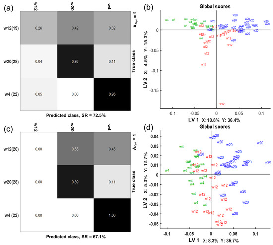 sMBPLSR confusion matrices (a,c) and global score plots (b,d) from time classification analysis using plasma, urine, and feces metabolomics in positive (a,b) and negative (c,d) ionization mode. The success rate (SR) of cross-validation is provided together with the number of latent variables of the models (AOpt). Numbers in parentheses (a,c) reflect the number of samples used in the multi-block analysis after a sample-to-sample correspondence. Explained variances (%) in matrices X and Y by the corresponding latent variables (LV) are provided (b,d).