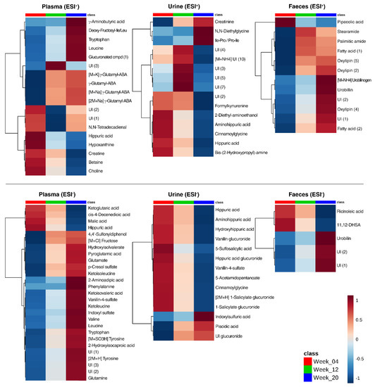 Heat map of metabolites discriminating (p < 0.05) between the weeks of dietary intervention in plasma, urine, and feces of Göttingen Minipigs analyzed in positive (ESI+) and negative (ESI−) ionization mode, presented as individual means per class group. Abbreviations: cmpd, compound; UI, unidentified; γ-glutamyl-ABA, γ-glutamyl-aminobutyraldehyde; 11,12-DHSA, 11,12-dihydroxystearic acid.