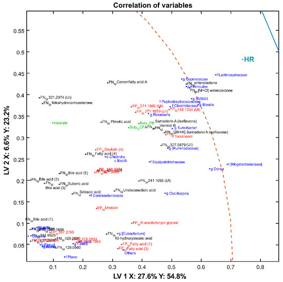 A detailed view of the correlation loading plot focusing on variables strongly associated with the HR diet (for a global overview of the correlation plot, we refer to Figure S5). Scores of a 4-block model: fecal ESI+ metabolomics (FPM, red), fecal ESI− metabolomics (FNM, black), SCFAs (green), metataxonomics (blue) are used to plot the correlations. The first two components are shown with the explained variances in sample matrix X and the dietary treatment Y. Abbreviations: g, genus; f, family; o, order; k, kingdom; p, phylum; c, class; UI, unidentified compounds.