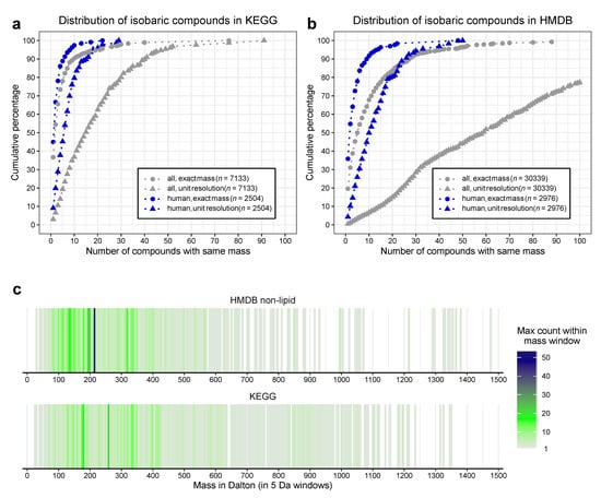 In line with this, the cumulative distributions are very similar, although the isomer-count is much higher in the HMDB (Figure 1b and Table S3) Here only % (in HMDB-all) or % (in HMDB-human) of the exact masses are exclusive to a single compound. This decreases for unit resolution to % (HMDB-all) and % (HMDB-human).