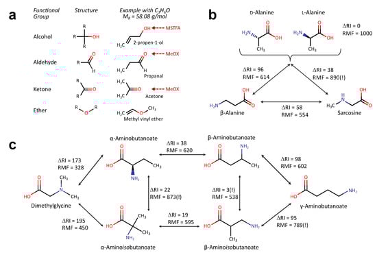 Discrimination of different functional groups by derivatisation. (a) Scheme illustrating the accessibility of different functional groups towards silylation (MSTFA) and methoxymation (MeOX). (b,c) Pairwise comparison of retention indices (RI) and reverse match factor (RMF) for metabolites with sum formula (detected as 2-TMS product) (b) and metabolites with sum formula (c). ΔRI: difference in retention index, stored in the GMD for metabolites with comparable derivatisation states (similar RI window), RMF: similarity of mass spectra obtained in pairwise comparison (0: no similarity—1000: equality).
