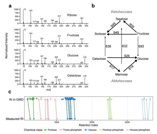 Mass spectra- and retention time similarities between sugars in measured by GC–MS. (a) Electron impact mass spectra of ribose (an aldopentose), fructose (a ketohexose), glucose and galactose (aldohexoses), note their similarity. (b) RMF-values between GMD spectra; ketohexoses (top) and aldohexoses (bottom). Arrows indicate direction of comparison (c) Retention indices as stored in the GMD (top) and measured on our system (bottom). Colours indicate groups of sugars, thus inherently similar compounds. Compounds detected in both setups are connected by lines to show the shifts between the systems. Note, that the shifts are not always identical and span over several other compounds in the GMD with similar mass spectra.