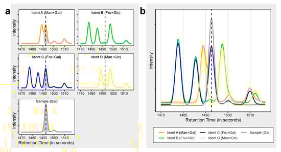 Application of the Ident-Mix for compound identification. (a,b) Illustration of retention validation using Ident-Mixes. four hexoses (fructose, glucose, galactose, mannose) with similar retention present in four different mixtures (Ident A to Ident D) and compared to a sample containing galactose. (a) shown with separate window for each compound as seen e.g., with Thermo Fisher Tracefinder software (b) Shown in overlay mode as seen e.g., with LECO ChromaTOF software.