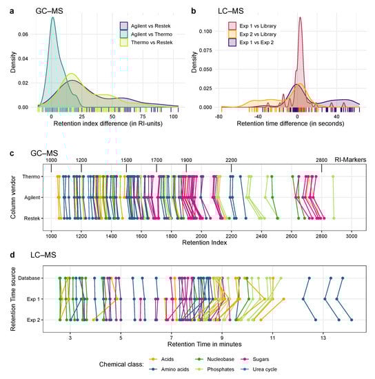 Second, for both the GC–MS and LC–MS data, the retention differences between measurements of the same compound in different setups is similar or higher than the difference between compounds of the same class. Further non-linear shifts complicate the interpretation and the reliable identification of metabolites.