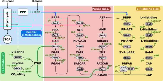 l-histidine biosynthesis is deeply intertwined with the central carbon metabolism, purine biosynthesis, and one-carbon metabolism (Figure 1). Due to this complexity, the analysis of the reaction network demands a different approach compared to classic linear biosynthesis pathways.