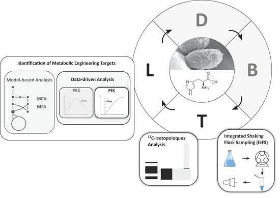 As an alternative to model-based techniques, purely data-driven approaches such as pool efflux capacity (PEC) may simplify and reduce modeling efforts, still producing similar results as model-based MCA approaches []. Even small 13C-based perturbations of anabolic biosynthesis pathways can be analyzed excluding the well-known drawback of metabolic leakage during cellular quenching and further streamlining the identification of strain engineering targets []. To showcase the application of DBTL cycles in industrial strain engineering, we generated three l-histidine producing Corynebacterium glutamicum strains (HIS1, HIS2, and HIS3). l-histidine is an especially challenging amino acid product due to the entwined biosynthesis with pathways such as purine biosynthesis and C1 metabolism (Figure 1).