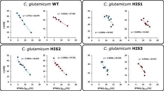 All relevant strains for this study were introduced and published previously [] and are shown in Table 1. Shaking flask cultivations of C. glutamicum WT, HIS1, HIS2, and HIS3 were carried out in biological triplicates (n = 3, 50 mL), as described in [] with the exception that the optical density at 600 nm (OD600) at the start of the cultivation of the main culture was 2.0. The maximal growth rate µmax was calculated by the linear regression of ln(OD600) plotted against the cultivation time in h during the exponential growth phase of the respective strain.