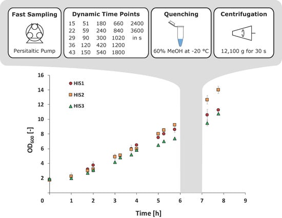 To achieve sufficiently small sampling intervals, a peristaltic pump was used, which was directly connected to a cannula inside the shaking flask. After the addition of the 13C5-d-ribose tracer, samples could be taken every seven seconds and were continuously increased up to 60 min (Figure 4). To inactivate the cellular metabolism, cell suspensions were directly transferred into 60% (v·v−1) methanol at −20 °C. Exponential pre-stimulus growth rates (µmax) of C. glutamicum HIS1 and HIS2 were 0.29 ± 0.02 h−1, and µmax for HIS3 was slightly lower with 0.25 ± 0.01 h−1. Interestingly, the HIS2 strain clearly had the highest optical density at the end of the experiment with OD600 = 14.2 ± 0.5 compared to 11.3 ± 0.8 (HIS1) and 10.7 ± 0.1 (HIS3) (Figure 4).