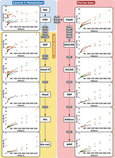 As a recycling pathway for AICAR, which is produced in the l-histidine biosynthesis, the purine biosynthesis plays an essential role in the biotechnological production of l-histidine with C. glutamicum []. As PRPP is the common precursor for both pathways (Figure 1), simultaneous labeling of the pathways was achieved. Analyzed intermediates of the purine pathway (Figure 5, right side) showed comparable labeling dynamics. Related to some targets in the l-histidine biosynthesis, SAICAR also did not reveal labeling in all three mutants due to pool levels below the detection limit. As seen before, multiple subsequent dynamics were observed in the metabolites of the purine biosynthesis like FGAR and SAICAR.