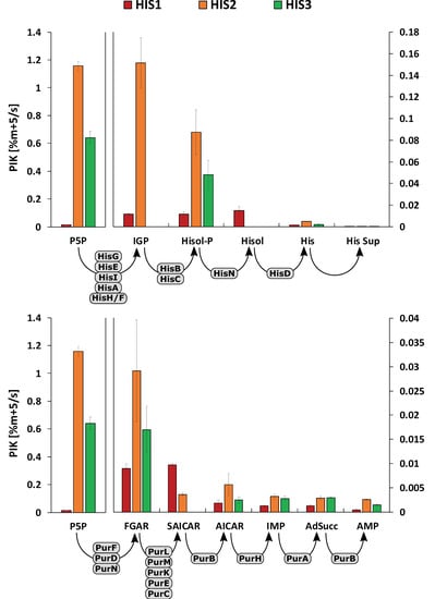Pool influx kinetics (PIK) of measured metabolites in the l-histidine biosynthesis (upper) and purine biosynthesis (lower). Standard deviations are given as error bars. Corresponding enzymes are depicted in grey. PIK values were based on the experiments of three biological replicates (n = 3).