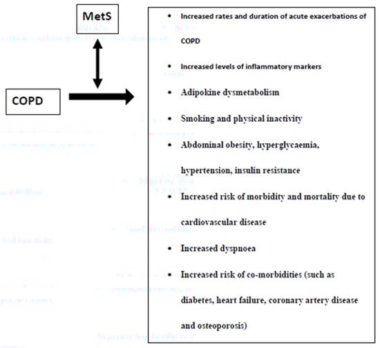 Overall, it is still not clear whether MetS could be a direct consequence of the COPD-related progressive lung dysfunction, in the absence of cigarette smoking or exposure to air pollution [48]. However, chronic systemic inflammation, adipose tissue dysfunction, oxidative stress, inhaled and oral glucocorticoids therapy, physical inactivity, hyperglycaemia, and aging could be involved in the development of MetS and other metabolic disorders in COPD patients [48].
