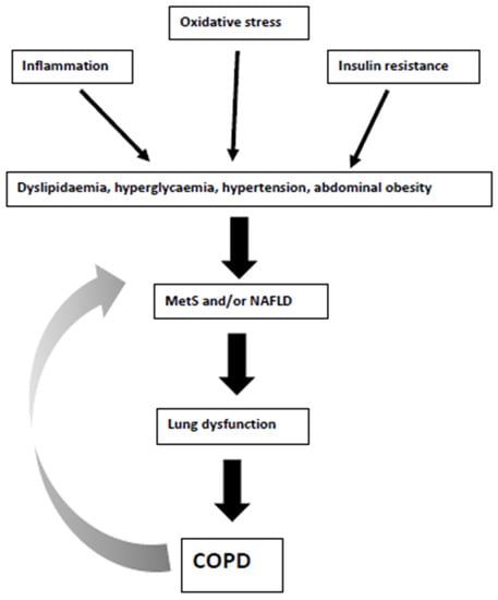 COPD may represent a “systemic” disease with inflammation, oxidative stress and insulin resistance playing key roles as the underlying mechanisms linking COPD with cardiometabolic disorders. Among the latter, MetS and NAFLD have been related to the presence and severity of COPD, as well as with increased CV morbidity and mortality [18,20,40,54,60,63]. In this context, dyslipidaemia, hyperglycaemia, hypertension, and abdominal obesity (i.e., features of both MetS and NAFLD) are predictors of lung dysfunction [36]. In other words, the pathogenesis of COPD and MetS has been described as “intertwined” [48]. Figure 2 summarizes the pathophysiological links between MetS, NAFLD, and COPD. On the other hand, treatment of MetS and NAFLD may improve survival and COPD prognosis [45,72]. Therefore, screening COPD patients for MetS and NAFLD may result in early diagnosis and treatment, leading to better outcomes.
