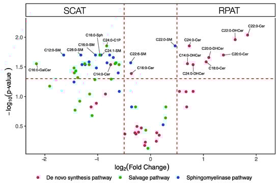 Figure 2. Volcano plot visualizing the fold change (retroperitoneal (RPAT) to subcutaneous adipose tissue (SCAT)) over the p-value of sphingolipids from six pairs of adipose tissues. The p-value of each sphingolipid species was calculated by paired Student’s t-test with false discovery rate (FDR) correction. The dotted horizontal line indicates a statistical threshold of p < 0.05, and the dotted vertical lines between −0.5 and 0.5 log2(fold change) indicate the 1-fold restriction threshold. The figure shows that sphingolipid species in the de novo synthesis pathway were more concentrated in RPAT. In contrast, sphingolipid species in the salvage pathway and the sphingomyelinase pathway were more concentrated in SCAT. Cer: ceramide; C1P: ceramide-1-phosphate; DHCer: dihydroceramide; GalCer: galactosylceramide; Sph: sphingosine; SM: sphingomyelin.
