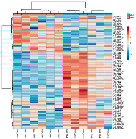 Figure 3. The heatmap with dendrograms visualizing the individual variability between the concentration of various sphingolipids in SCAT and RPAT of Holstein bulls. Data were log-transformed and Pareto-scaled. Samples (bulls) and features (metabolites) were clustered in Euclidean distance with the Ward algorithm.