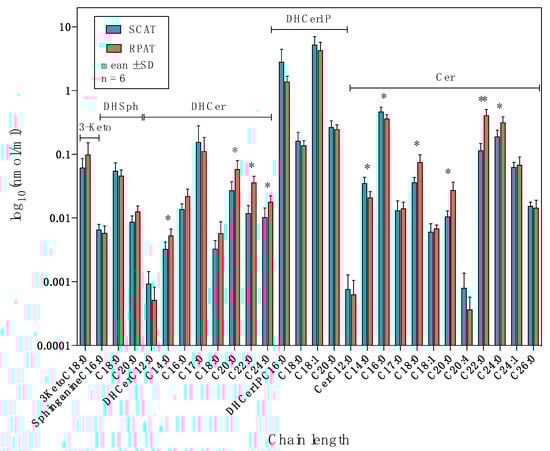 Figure 4. The distribution of sphingolipids in the de novo synthesis pathway in subcutaneous (SCAT) and retroperitoneal adipose tissue (RPAT) in German Holstein bulls (n = 6). Data are presented as the mean ± standard deviation (SD) on a logarithmic scale. 3-Keto: 3-ketosphinganine concentration; DHSph: sphinganine concentration; DHCer: dihydroceramide concentration; DHCer1P: dihydroceramide-1-phosphate concentration; Cer: ceramide concentration. Asterisks indicate significant differences (* p < 0.05; ** p < 0.01) between two adipose tissues by paired Student’s t-test with FDR correction.