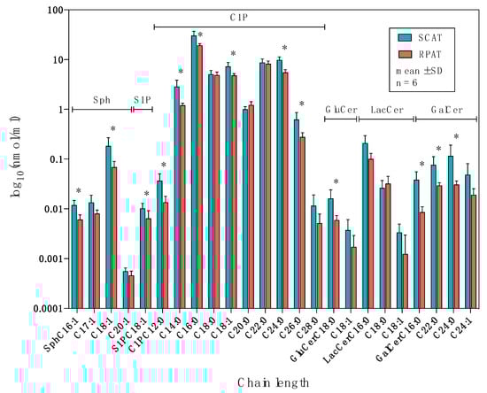 Figure 5. The distribution of sphingolipids in the salvage pathway in subcutaneous (SCAT) and retroperitoneal adipose tissue (RPAT) in German Holstein bulls (n = 6). Data are presented as the mean ± standard deviation (SD) on a logarithmic scale. Sph: sphingosine concentration; S1P: sphingosine-1-phosphate concentration; C1P: ceramide-1-phosphate concentration; GluCer: glucosylceramide concentration; LacCer: lactosylceramide concentration; GalCer: galactosylceramide concentration. Asterisks indicate significant differences (* p < 0.05) between two adipose tissues by paired Student’s t-test with FDR correction.