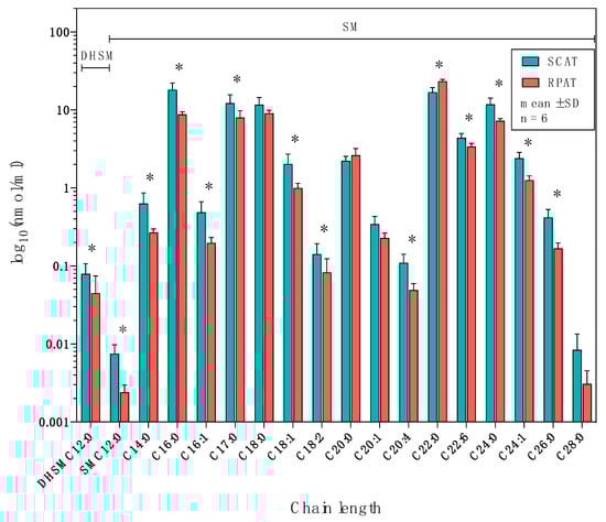 Figure 6. The distribution of dihydroceramide and sphingolipids of the sphingomyelinase pathway in subcutaneous (SCAT) and retroperitoneal adipose tissue (RPAT) in German Holstein bulls (n = 6). Data are presented as the mean ± standard deviation (SD) on a logarithmic scale. DHSM: dihydrosphingomyelin concentration; SM: sphingomyelin concentration. Asterisks indicate significant differences (* p < 0.05) between two adipose tissues by paired Student’s t-test with FDR correction.
