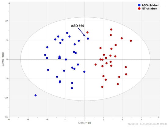 The urinary metabolic profile of children with ASD was largely distinguishable from that of NT children (Figure 1); the quality of this model was represented by R2 X = 0.525, R2 Y = 0.808, Q2 = 0.609 and confirmed by analysis of variance CV-ANOVA (p < 0.0001).