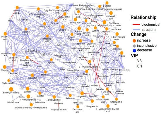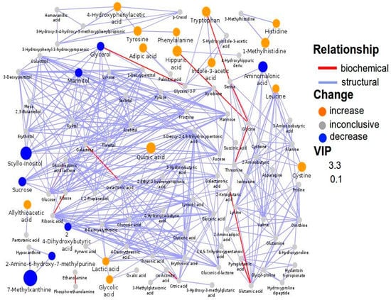 Biochemical network mapping resulting from the comparison between the urine metabolome of ASD children and that of NT children. Metabolites connections are based on biochemical (red edges) and structural (violet edges) similarities. Structural similarity is shown for Tanimoto coefficients (≥0.7, solid edges) and relaxed scores (dashed edges). Node size displays model VIP and color the direction of change in ASD relative to control samples.