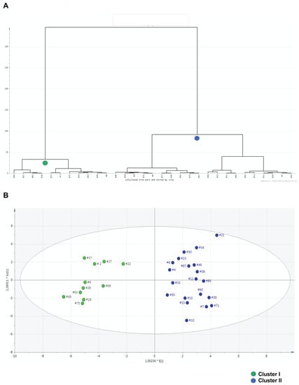 Hierarchical cluster analysis (HCA) represented by the dendrogram plot (A); the horizontal lines depict the grouping of clusters and the distance between two joining clusters, the vertical lines represent the differences of these distances. OPLS-DA scatter plot (B) of the first principal component obtained from GC-MS spectra of urine samples from cluster I (green dots, n = 11) and cluster II (blue dots, n = 20). Both dendrogram and OPLS-DA scatter plot report the identification number for each urine metabolome. Clusters I and II were obtained by HCA, as depicted by the dendrogram.